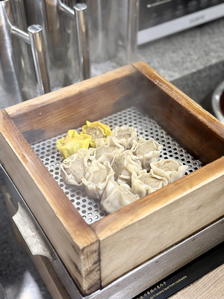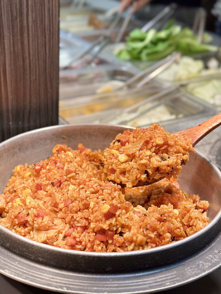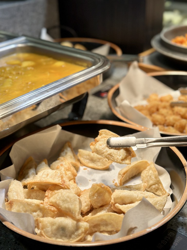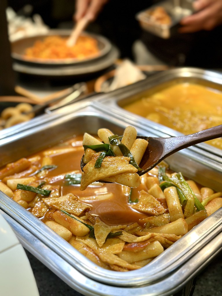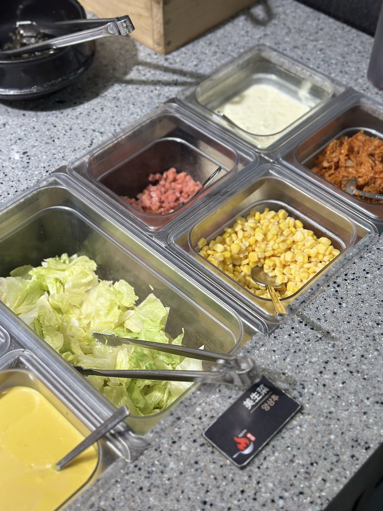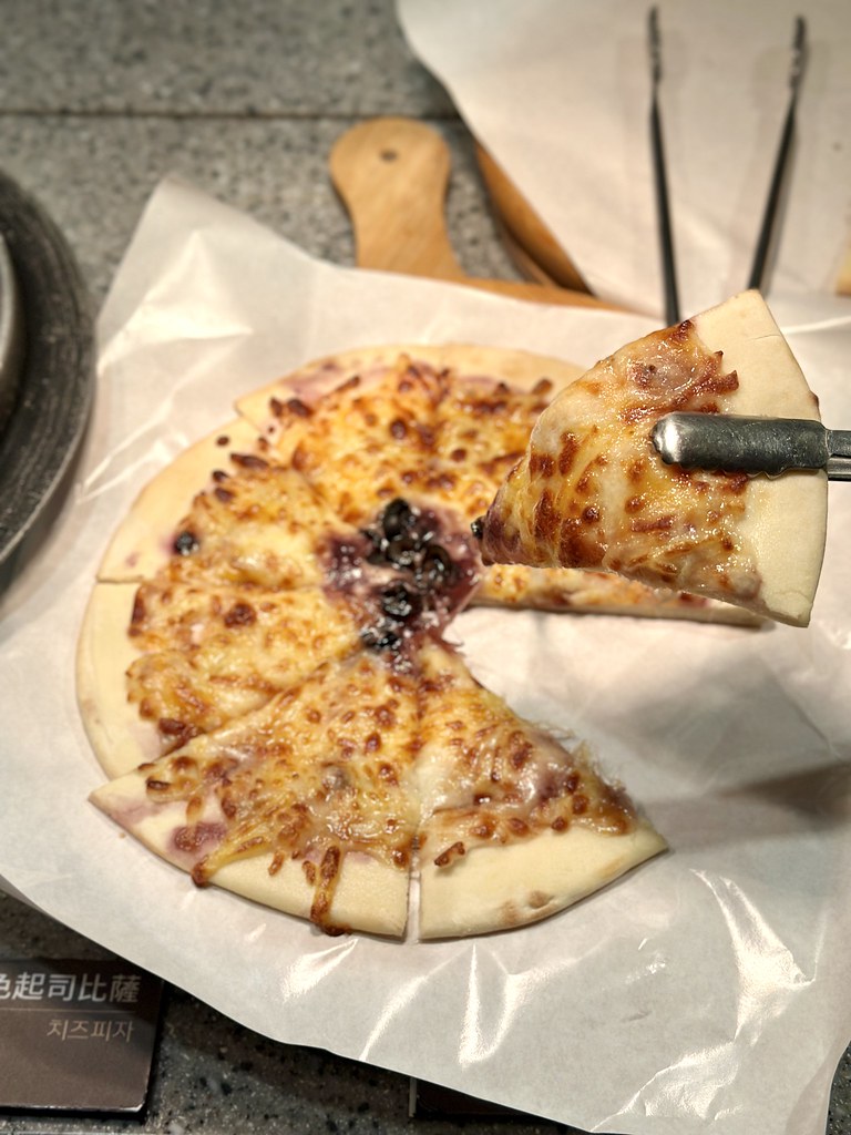自助吧食材多元 , 居然有藍莓口味的披薩、韓式炸雞、韓國魚板串、韓式年糕、炒飯、炸物