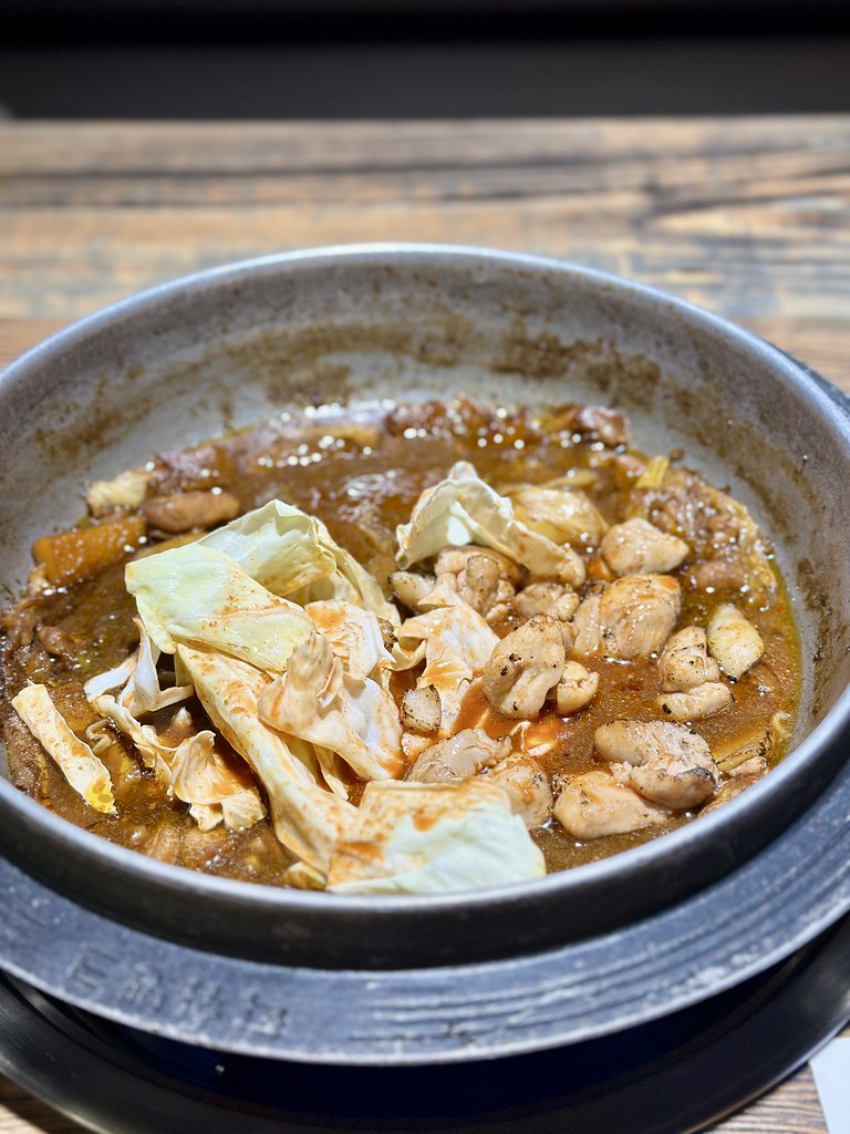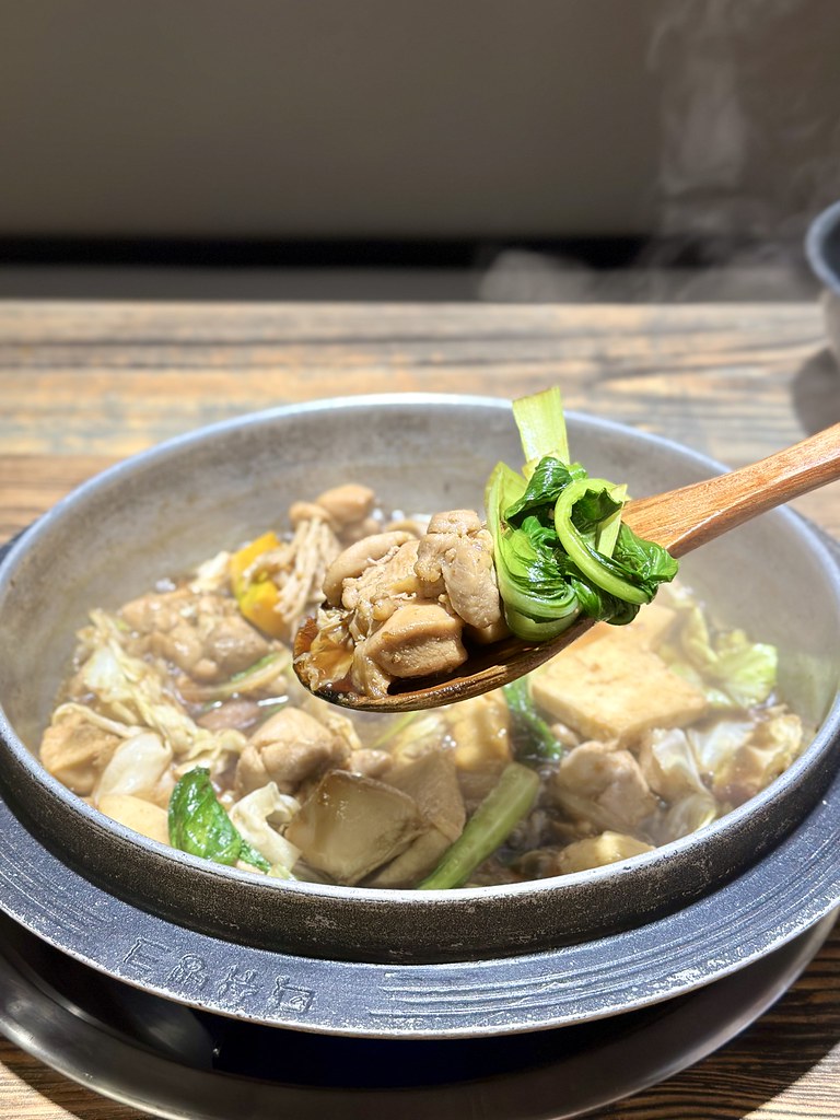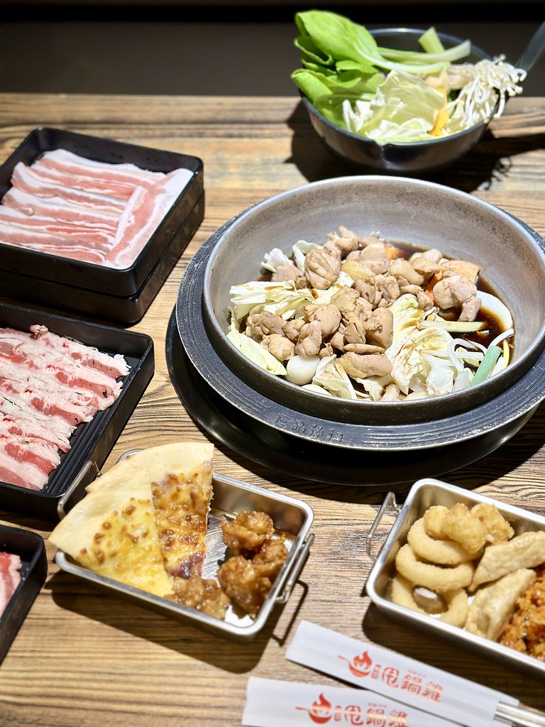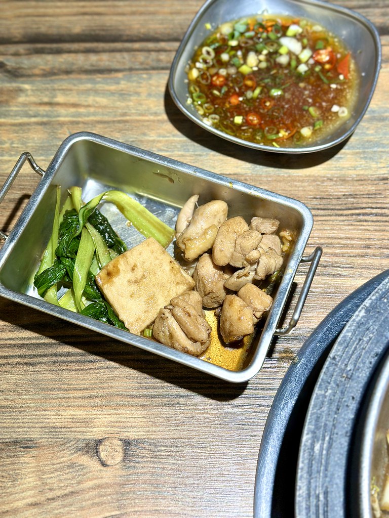 主菜炙燒雞是新鮮雞腿肉 , 雞肉份量給得很充足 , 主鍋上桌後 , 倒入自己喜愛的鍋料 , 再計時7分鐘悶煮 , 時間到時 , 服務人員會過來開鍋拌炒 , 翻炒後就美味上桌