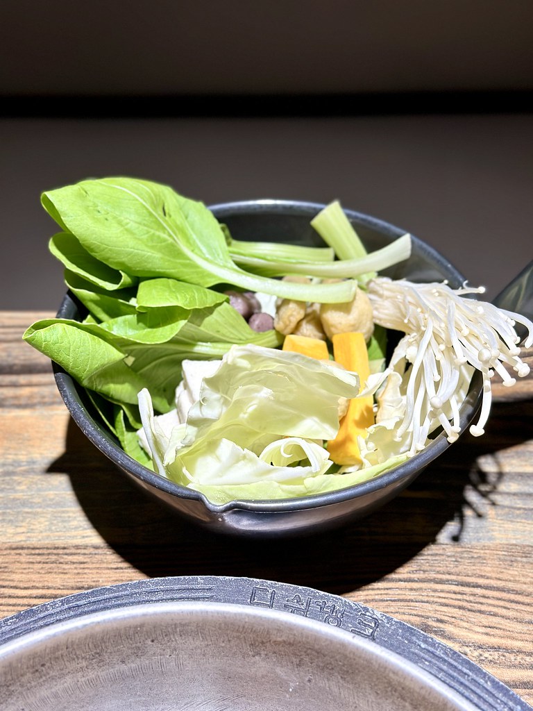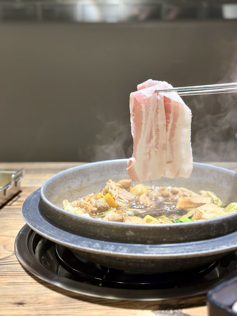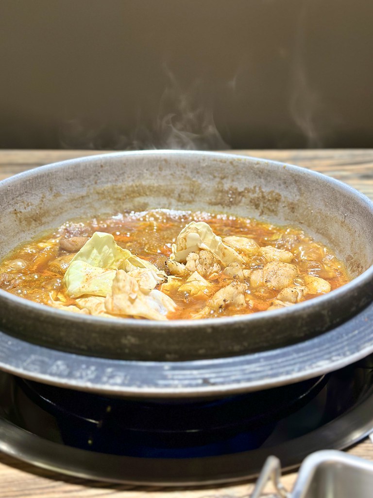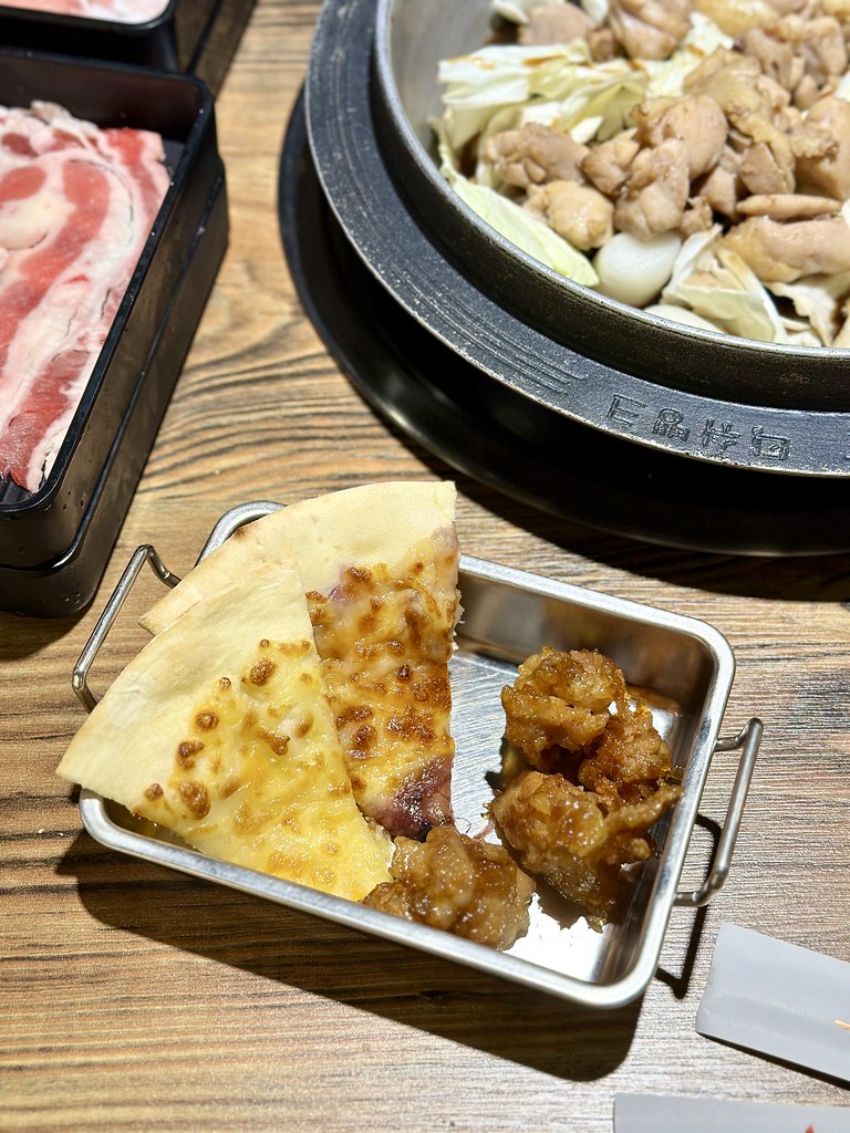 主菜炙燒雞是新鮮雞腿肉 , 雞肉份量給得很充足 , 主鍋上桌後 , 倒入自己喜愛的鍋料 , 再計時7分鐘悶煮 , 時間到時 , 服務人員會過來開鍋拌炒 , 翻炒後就美味上桌
