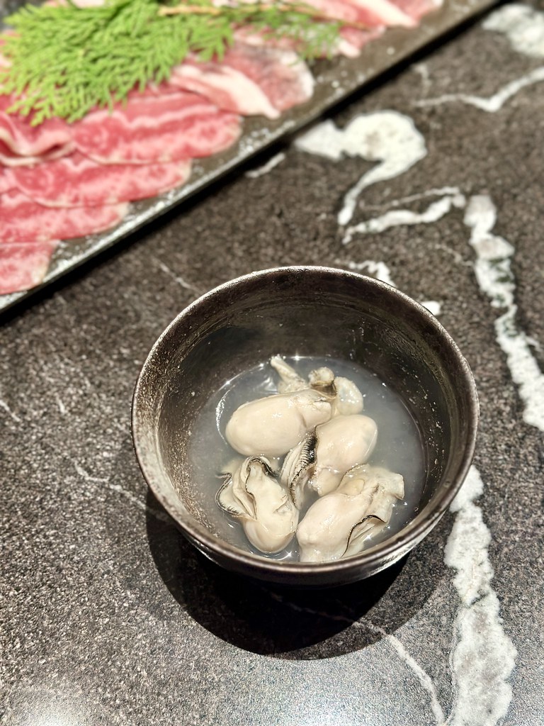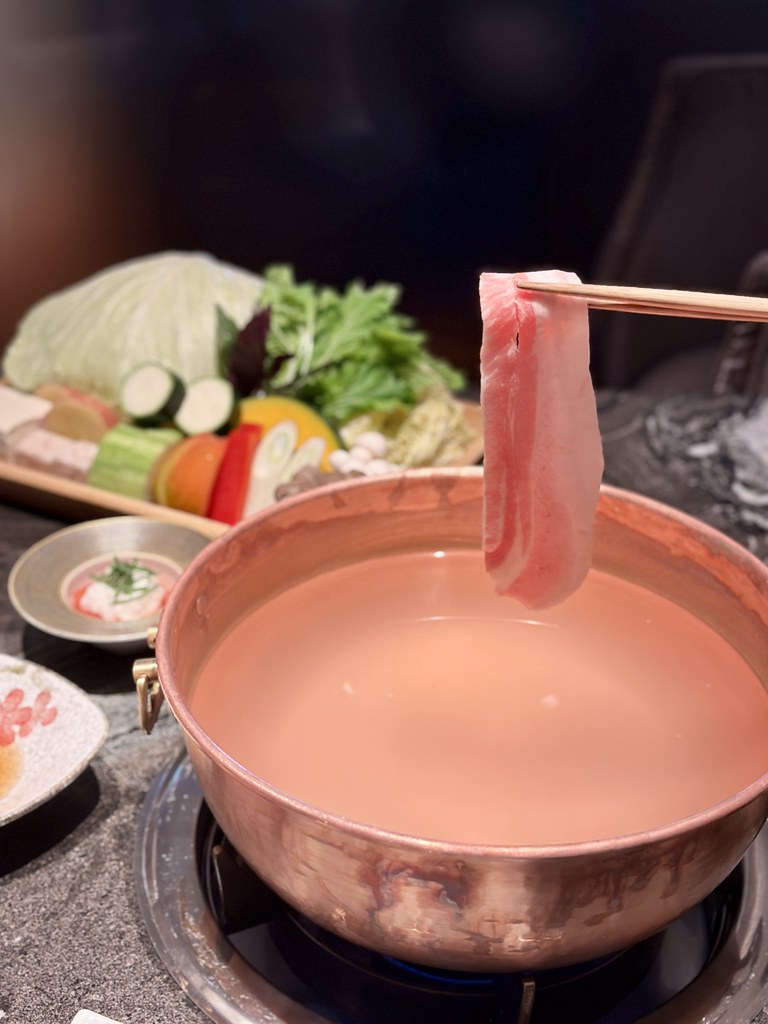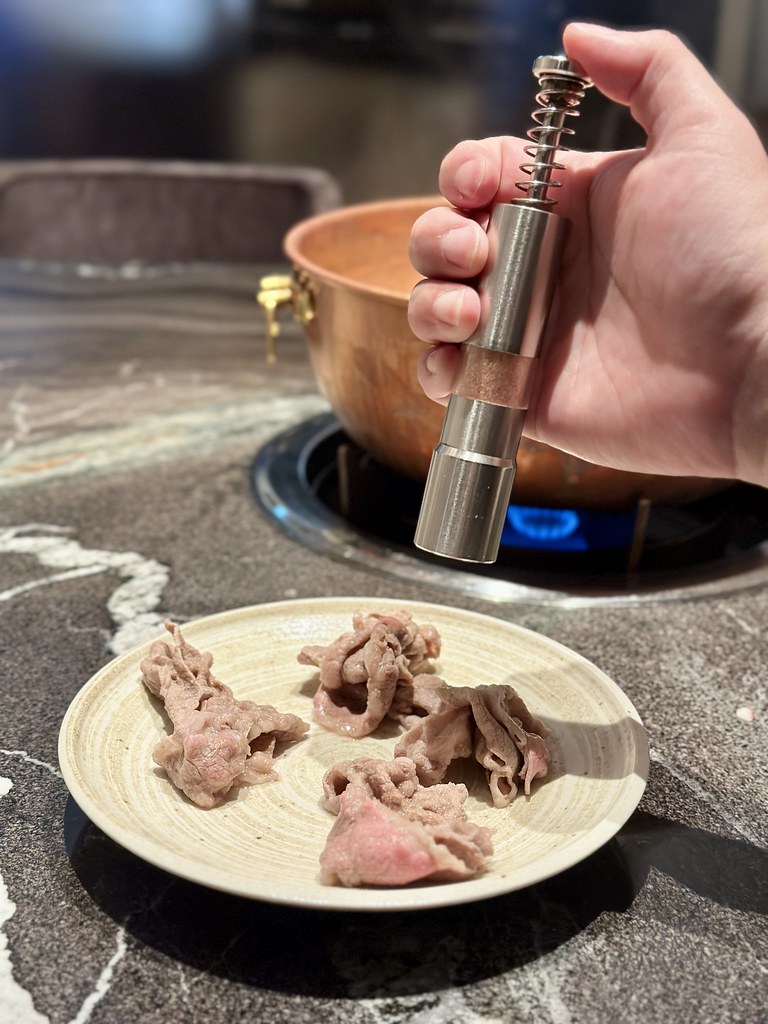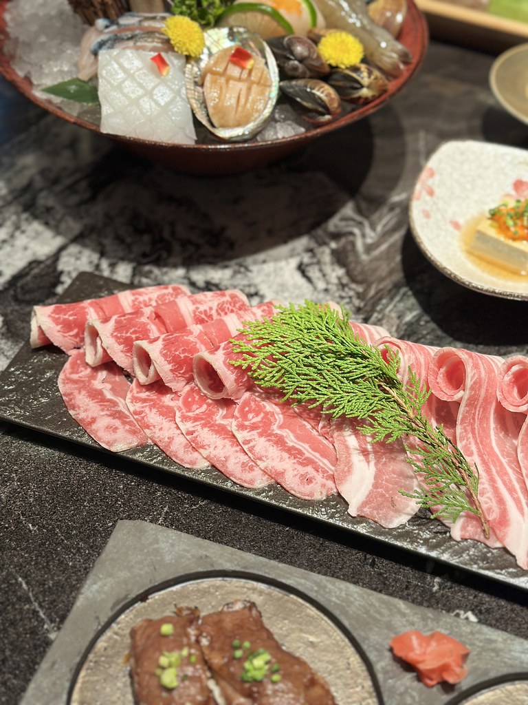 嚴選肉品 – 美國雪花牛胸腹肉淡淡的粉嫩色澤 , 入口是豐沛的油脂及濃郁牛肉香氣 , 非常軟嫩 , 來自雲林的台灣黑臻豚五花 , 軟中帶勁 , 可以來點海鹽品嘗肉品的原味 , 或沾點醬料享受涮煮後的肉感