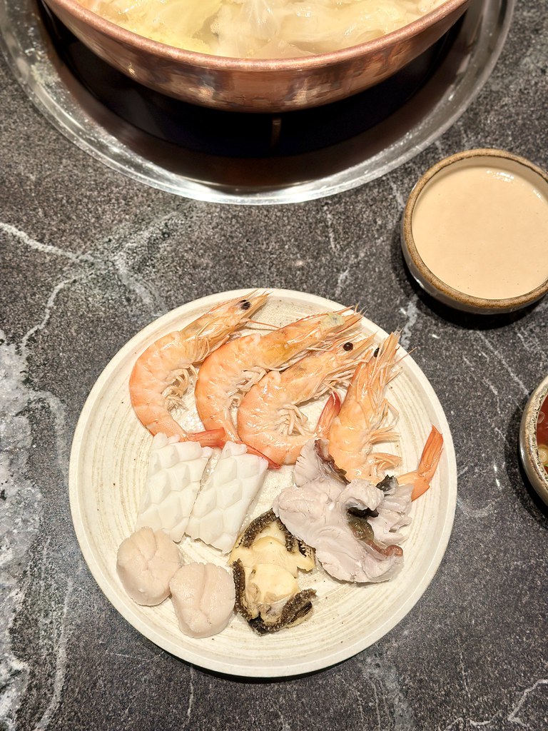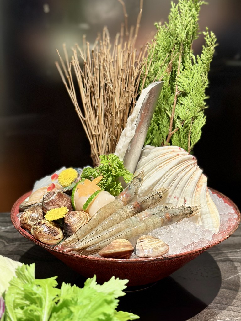 特選海鮮盛合 – 精緻擺盤包含鮮彈的鮑魚、甘甜的北海道干貝、白蝦和真鯛 , 滿滿鮮味 , 喜歡海鮮的人可以大塊朵頤