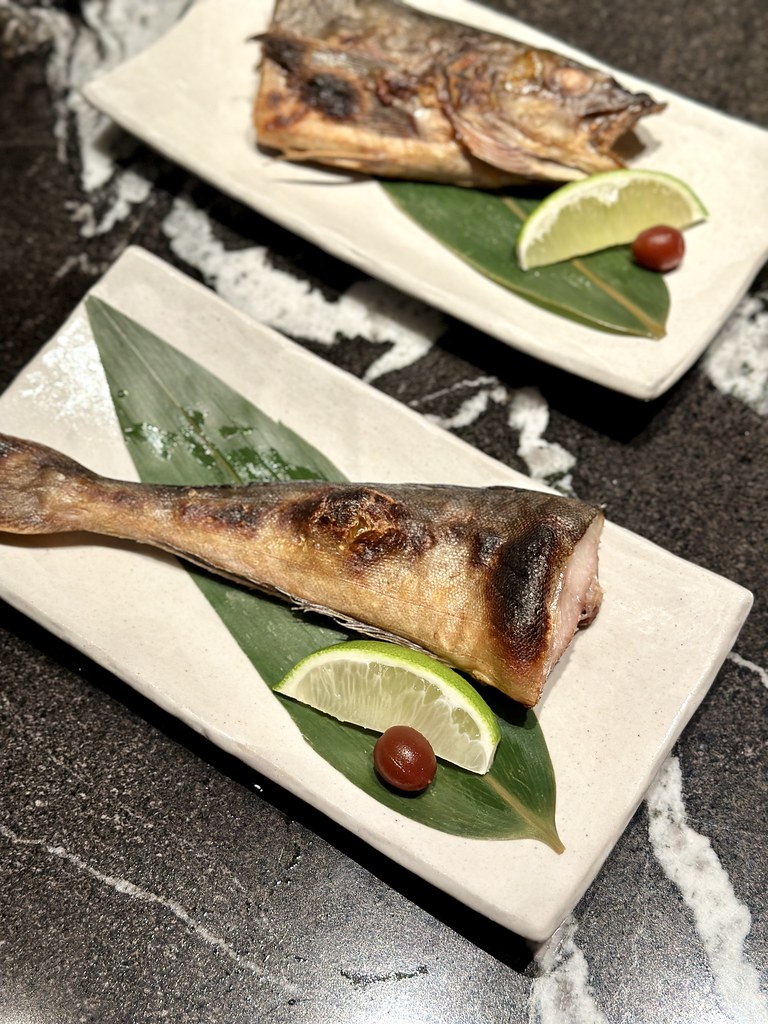 鹽烤鮮魚 – 燒烤至表面金黃的花魚一夜干 , 展現了魚肉的細嫩鮮甜 , 可以擠點檸檬提味增添清香