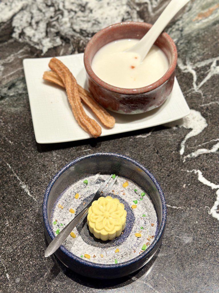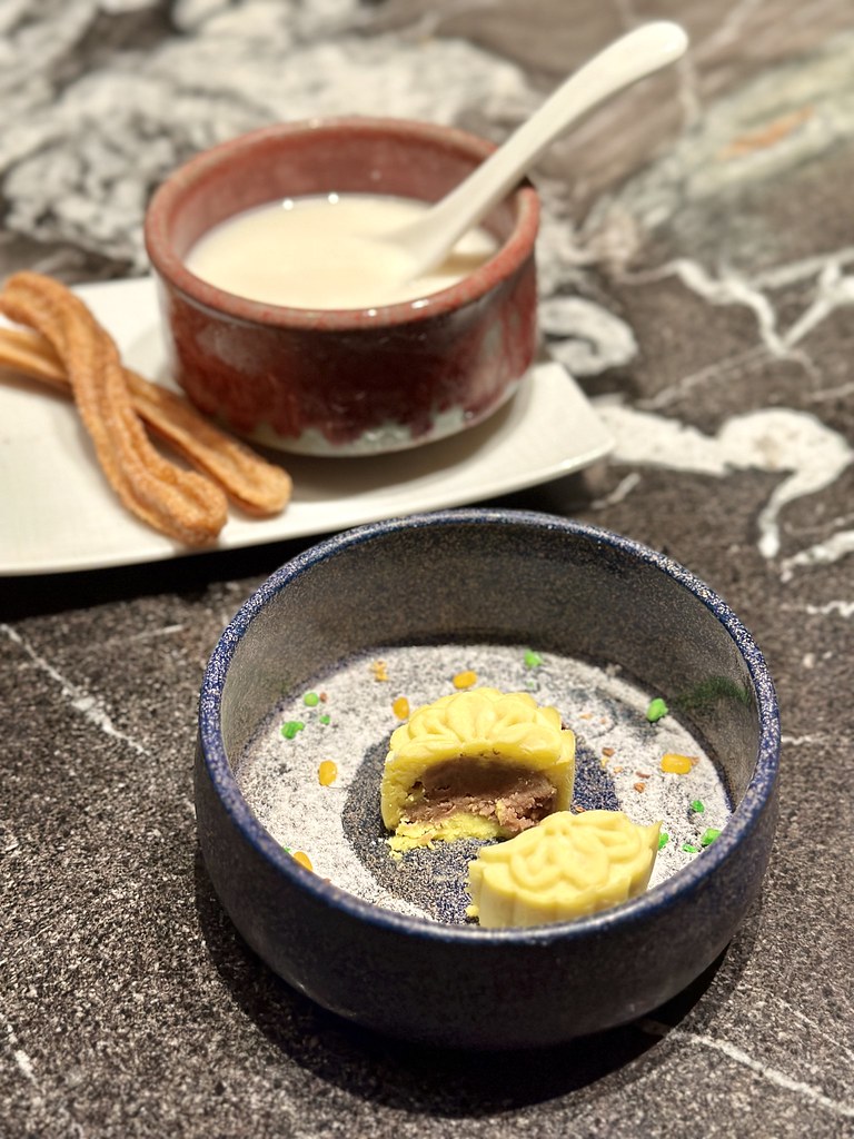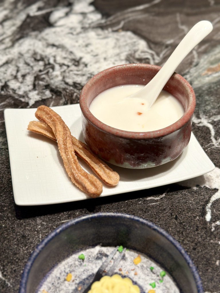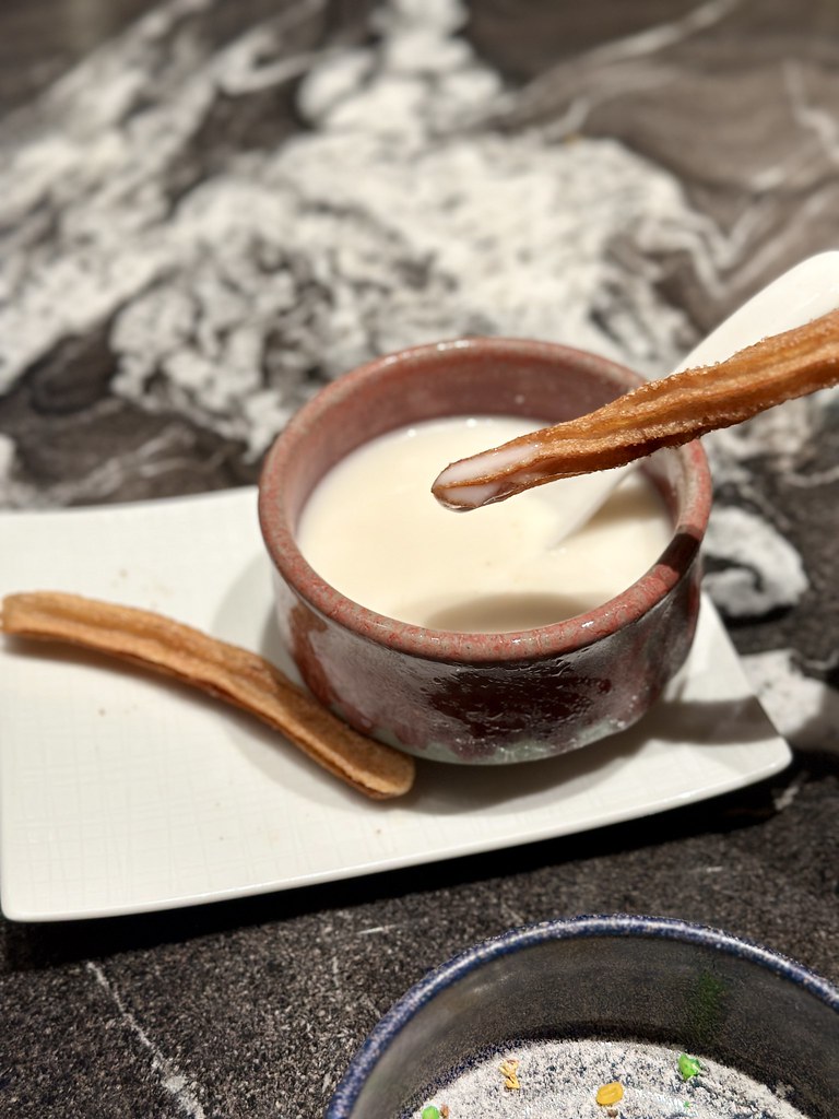 最後甜點是杏仁湯佐吉拿棒 , 肉桂吉拿棒與杏仁湯意外合拍