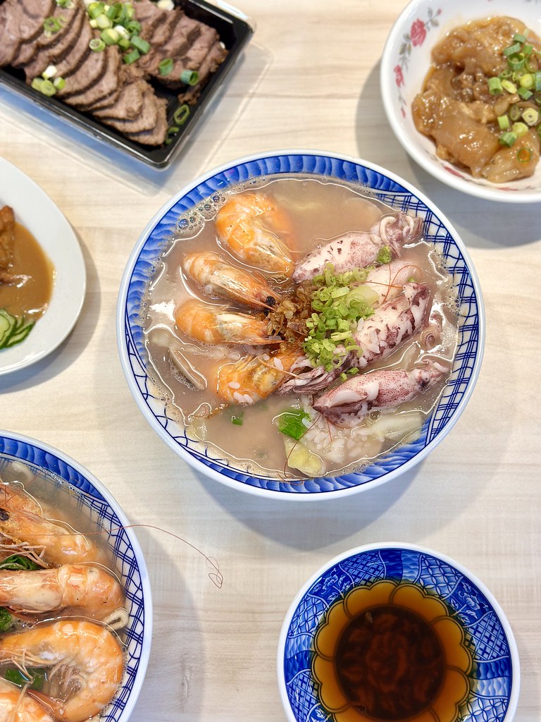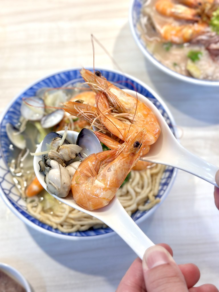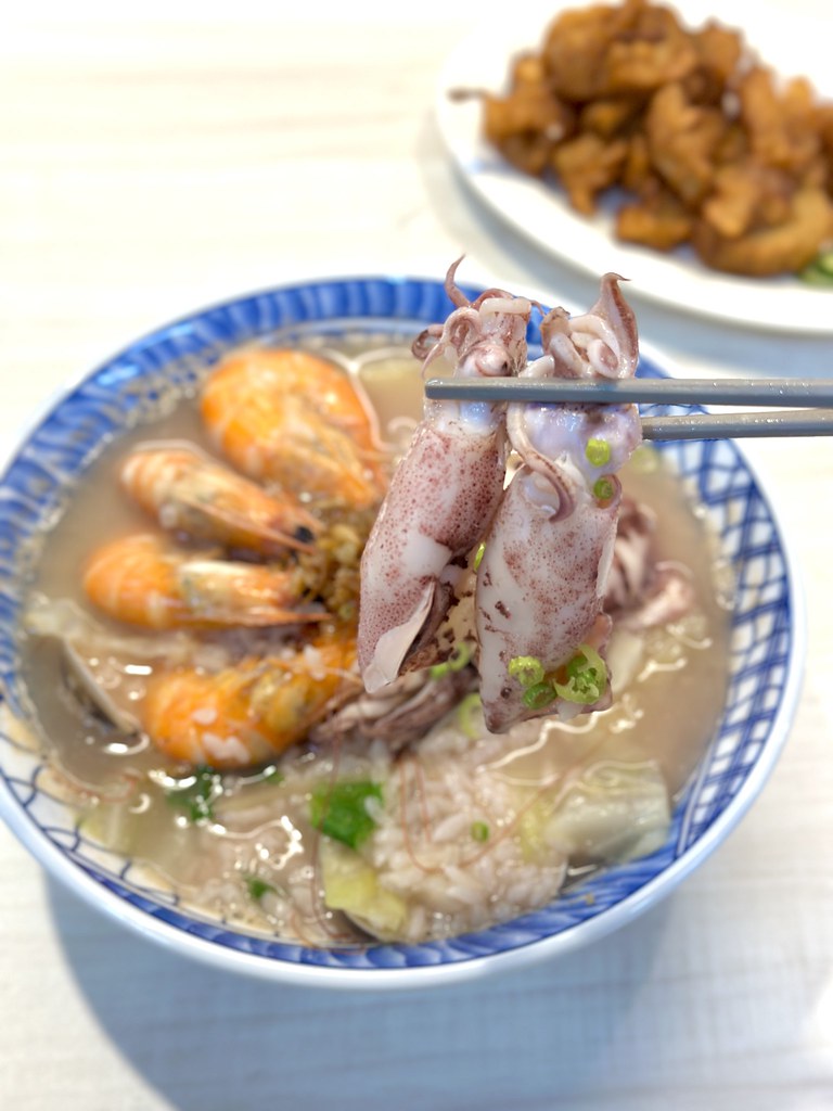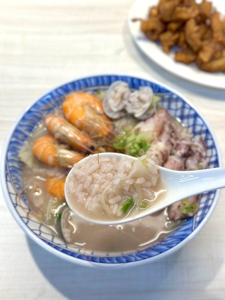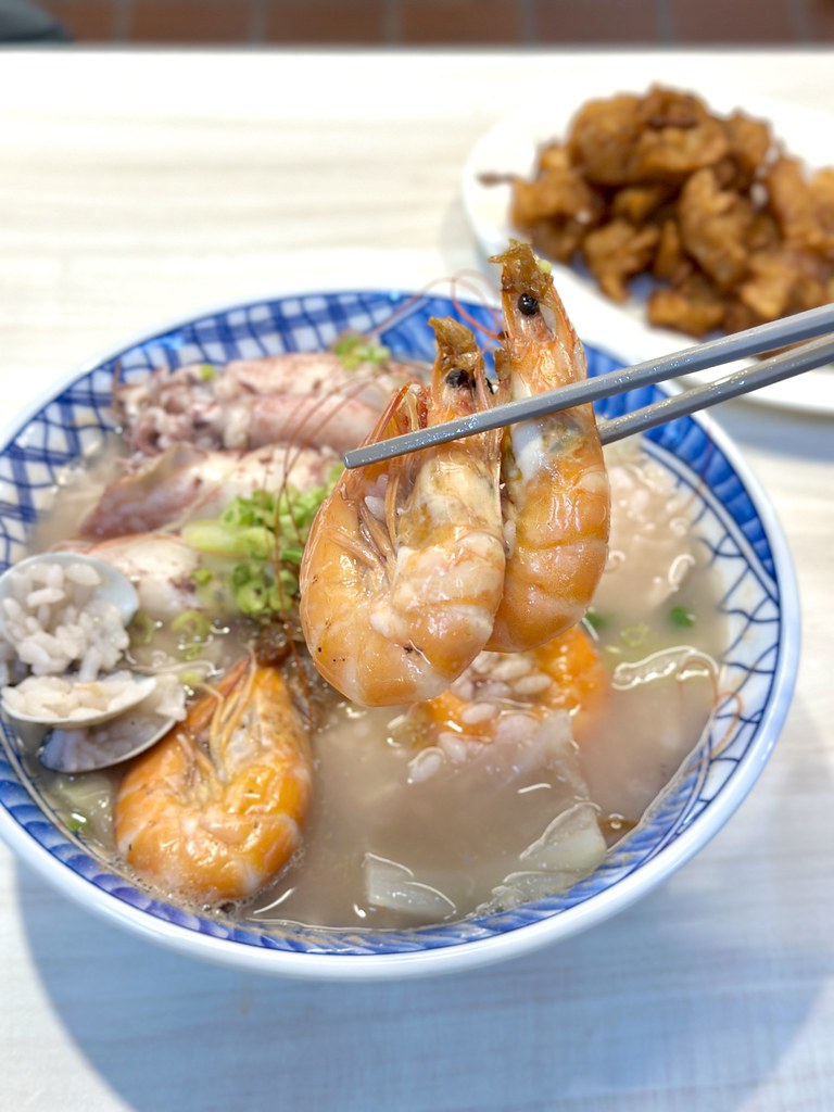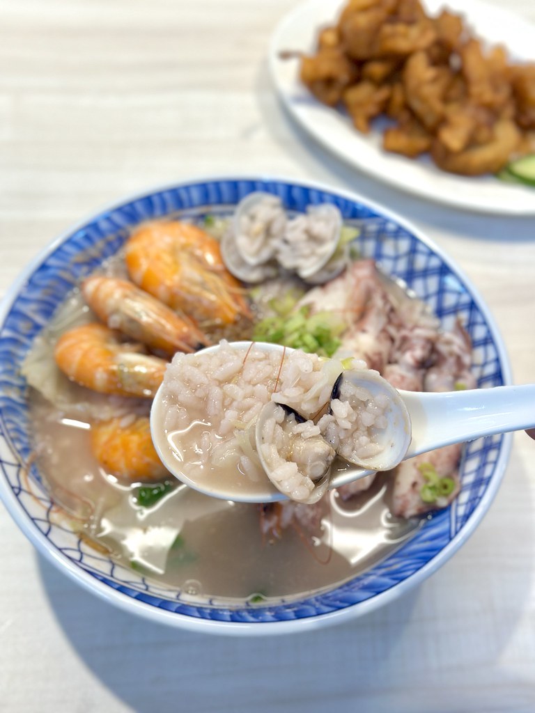 米飯控主食也可以選粥 , 早上來碗海鮮粥有多舒服 , 痛風蝦2號有一口入魂的鮮彈小卷 , 肥美又鮮還會爆汁的鮮蚵、蛤蠣 , 撒上些許油蔥提升香氣 , 滿滿海味與粥品交織 , 清爽的鮮美簡直太過癮了