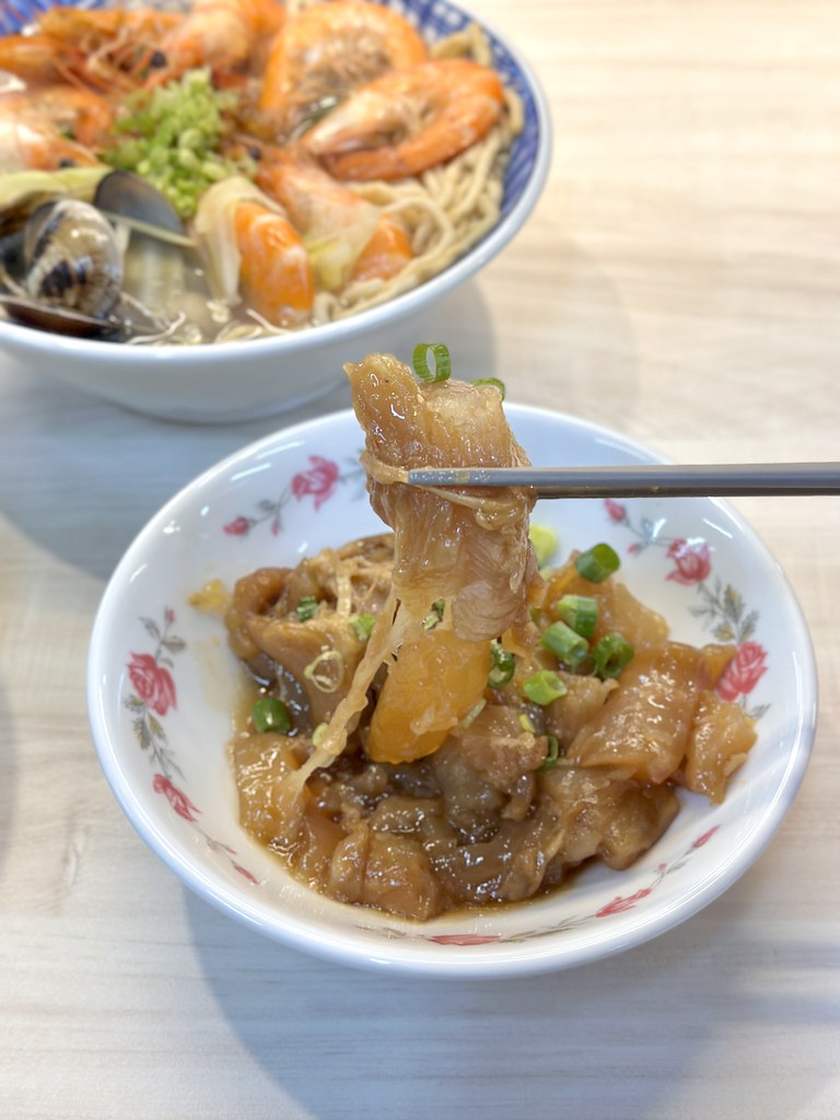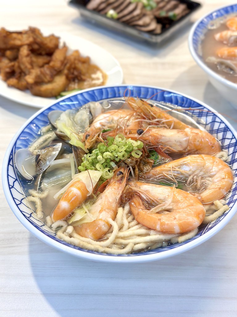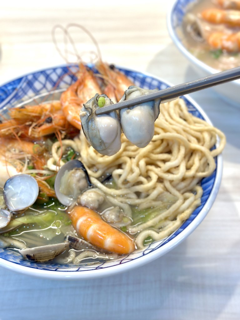 料多到要滿出來的痛風鮮蚵意麵 , 打造濃郁的海鮮爆擊 , 清爽甘甜的湯頭 , 滿滿白蝦份量超實在 , 搭配大顆鮮嫩鮮蚵及蛤蠣 , 層層堆疊出的鮮味 , 伴隨著有點Q度的意麵及香氣 , 好有飽足感