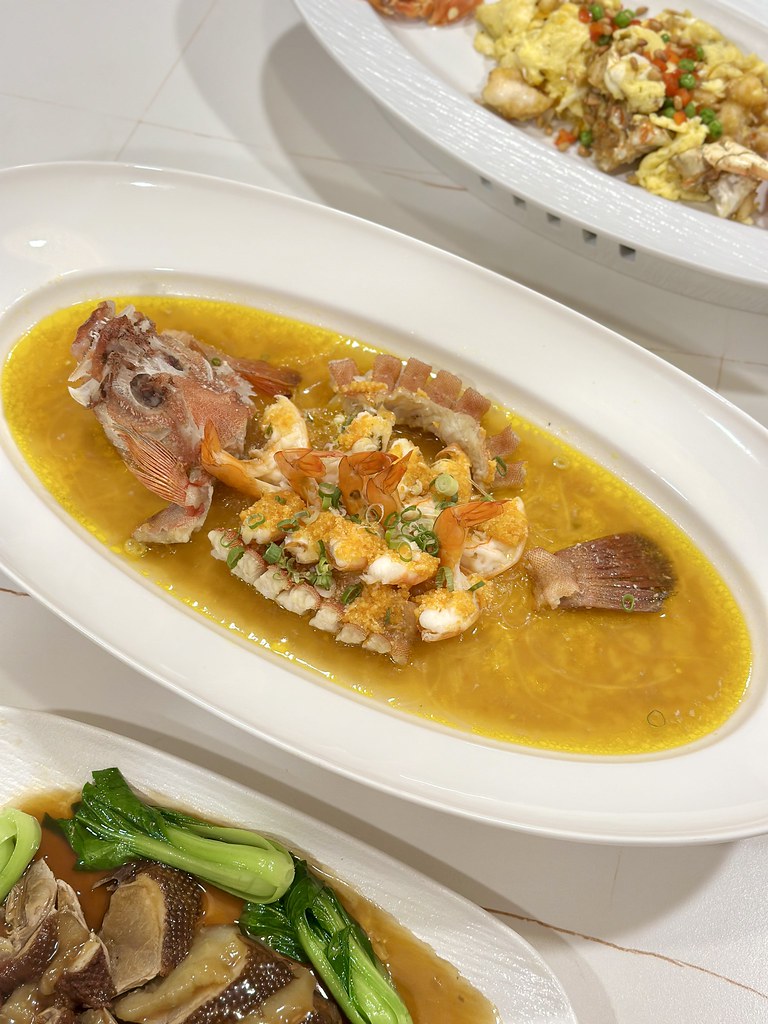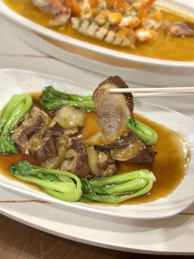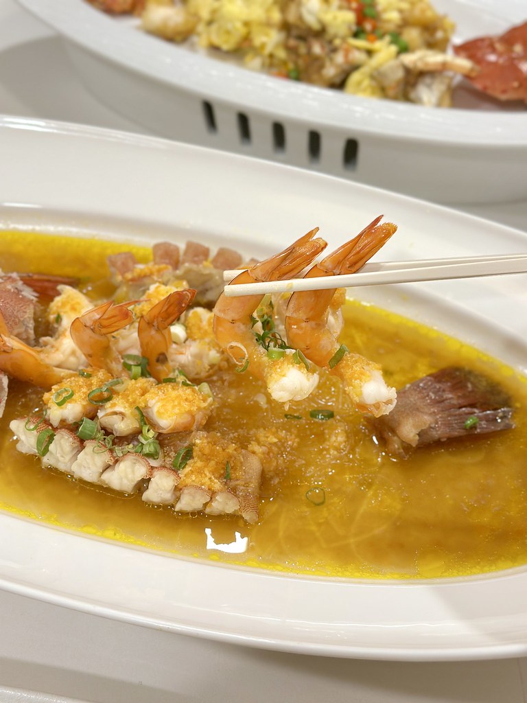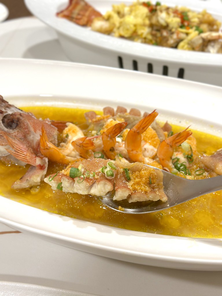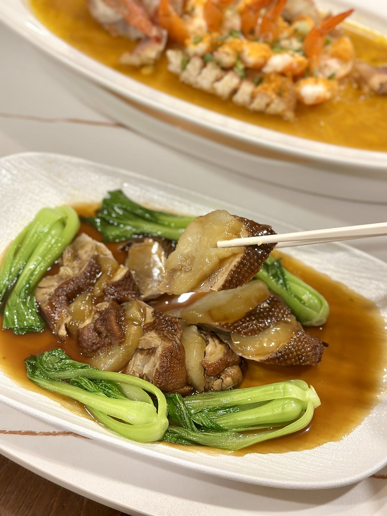 魚子蒜雙燕蒸海石斑 – 大尾的石斑經過巧妙的刀工 , 魚肉片成塊狀 , 肉質飽滿 , 加入鮮蝦 , 有些許蒜香提味 , 滿滿鮮甜風味 , 石斑和鮮蝦都非常新鮮好吃