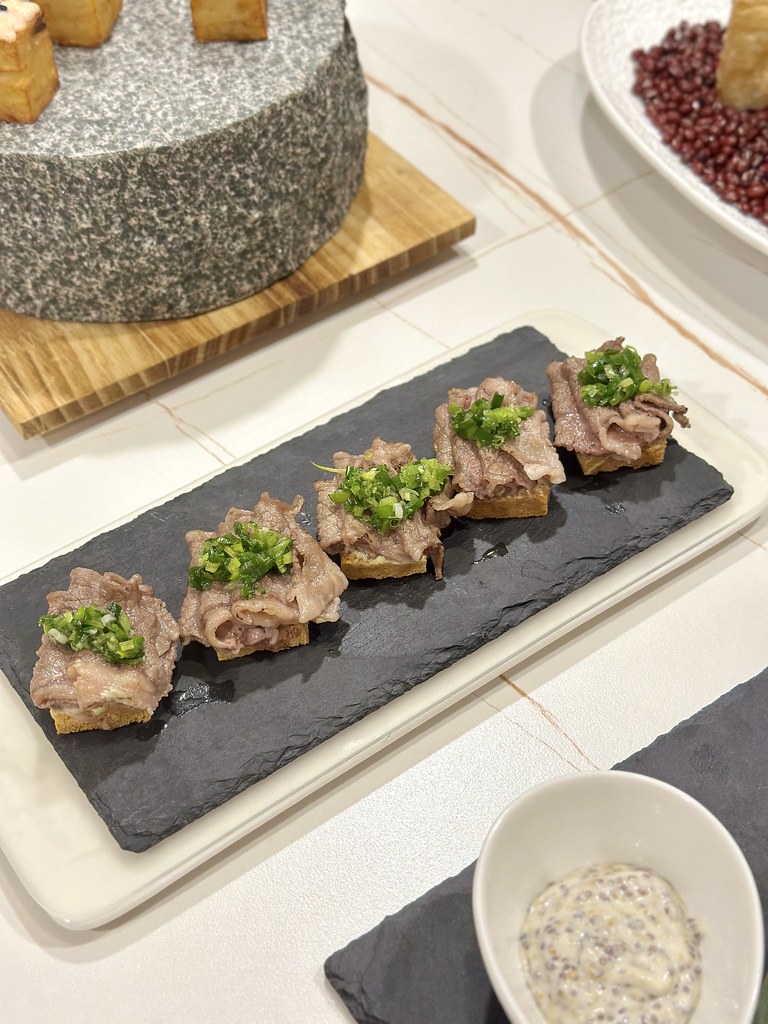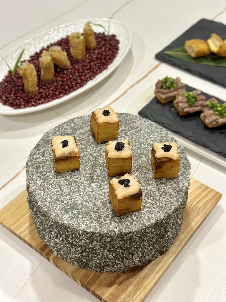 夏日迎賓三彩碟 – 精緻的開胃前菜 , 雙子醬千層塔塔用烏魚子、明太子醬搭配綿密馬鈴薯 ,  蔥油牛佐香酥片~ 軟嫩與酥脆的兩種口感 , 脆皮百花玉芙蓉 ~ 雞蛋豆腐與蝦漿的協調 , 開胃菜就非常精彩