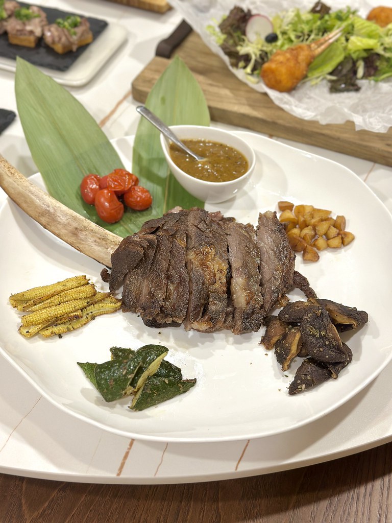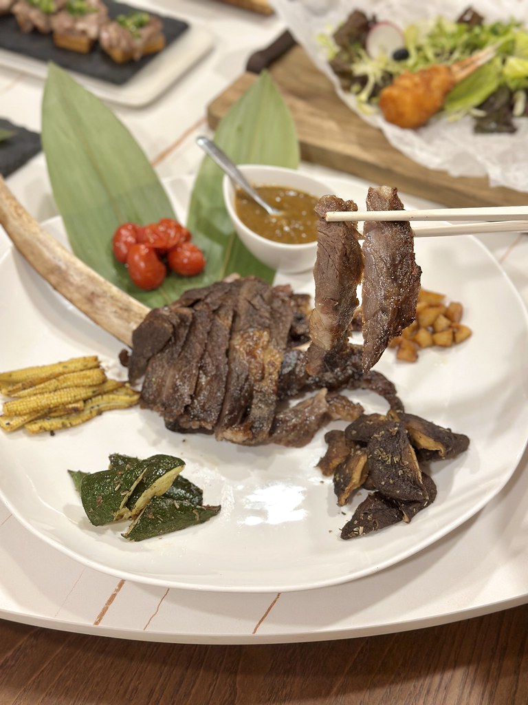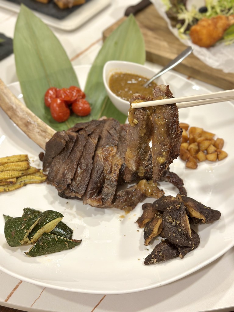 黑椒慢烤舒肥戰斧牛 – 戰斧牛有烤過的香氣 , 軟嫩又鮮甜 , 已經分切好 , 可以直接入口輕鬆品嘗 , 沾上醬料更對味