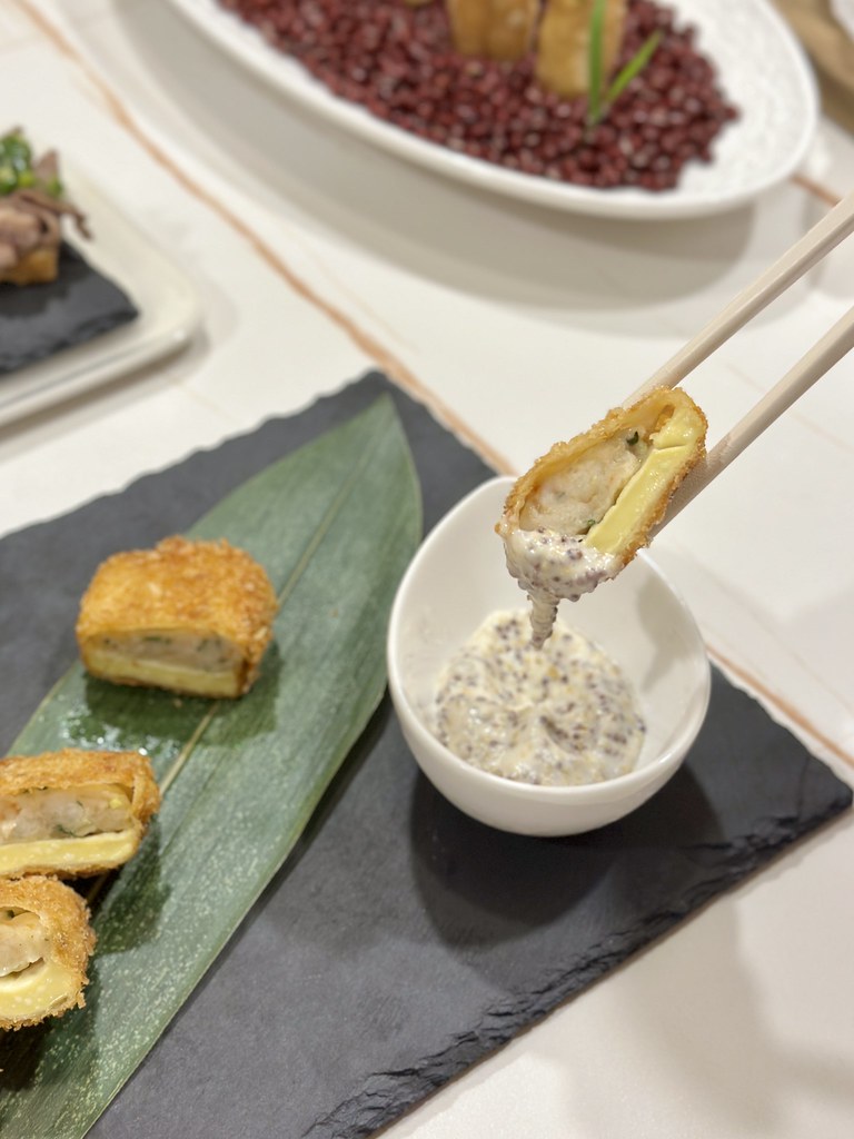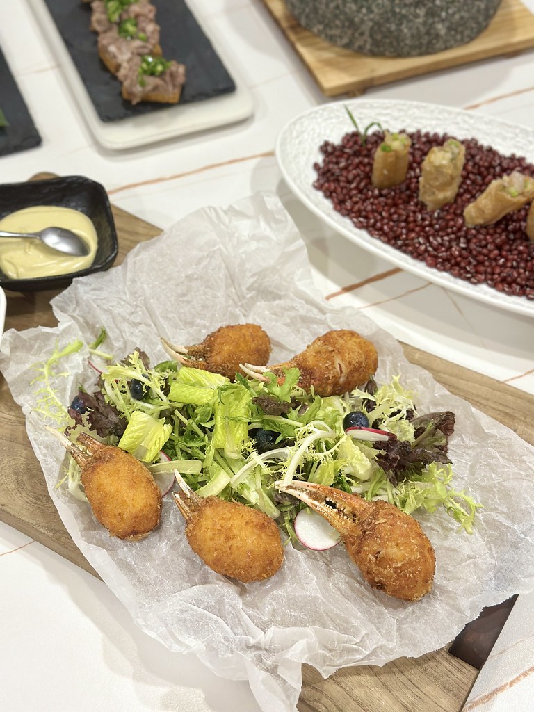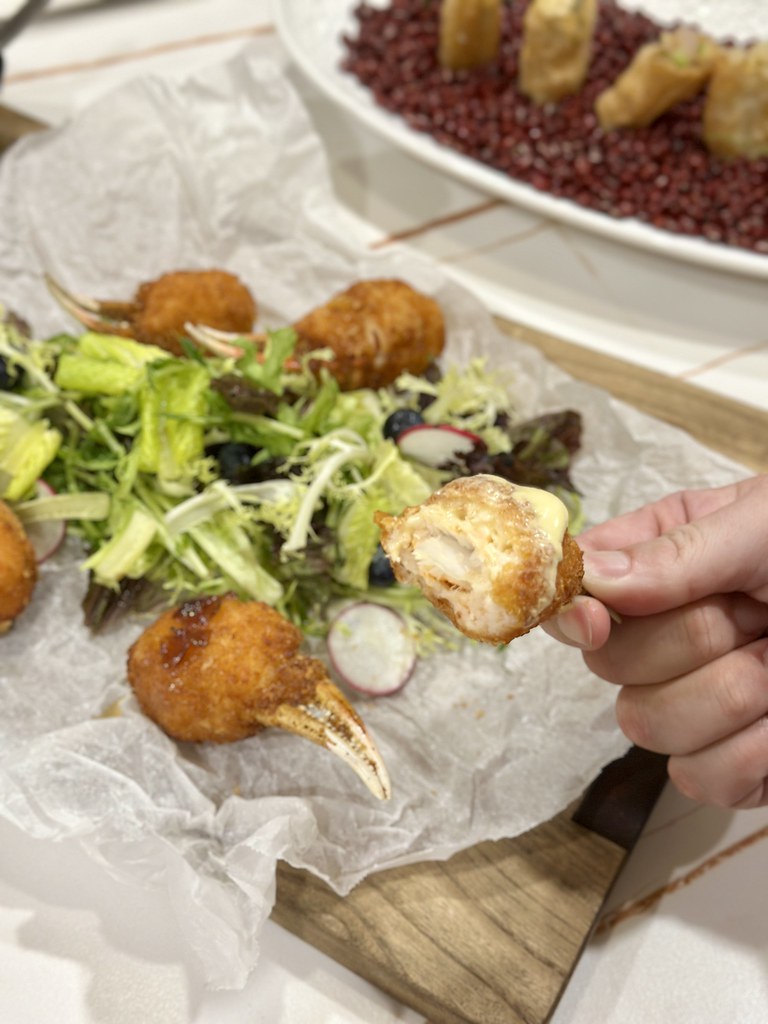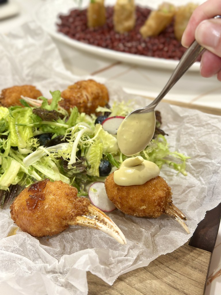 黃金百花松葉鉗 – 圓潤小巧的外型特別讓人喜歡 ,  花枝漿香包覆著大隻的松葉蟹鉗 , 本身就很香的松葉鉗 , 再沾上酸甜的梅醬與塔塔醬 , 馬上就被清盤了