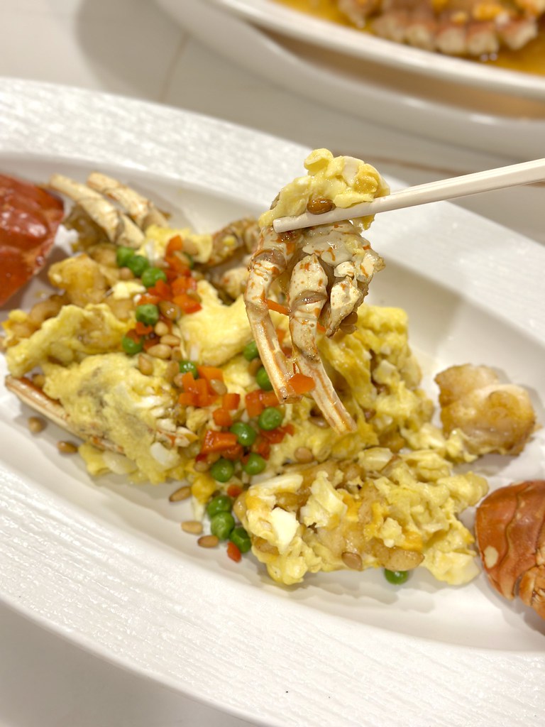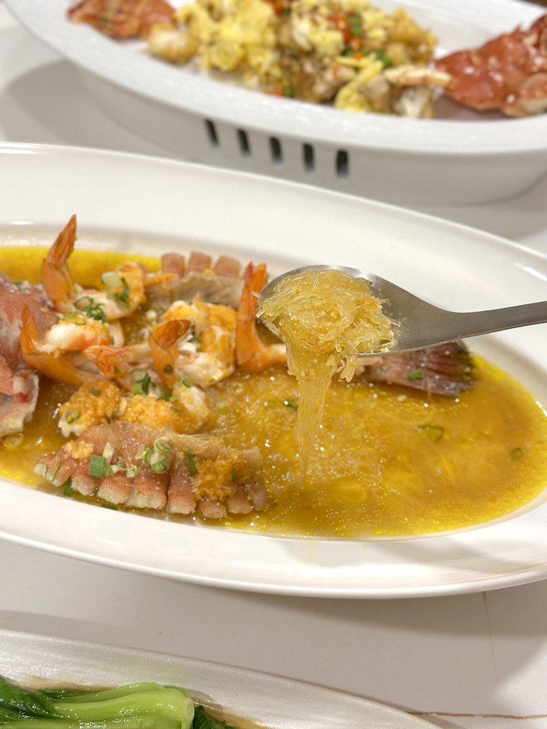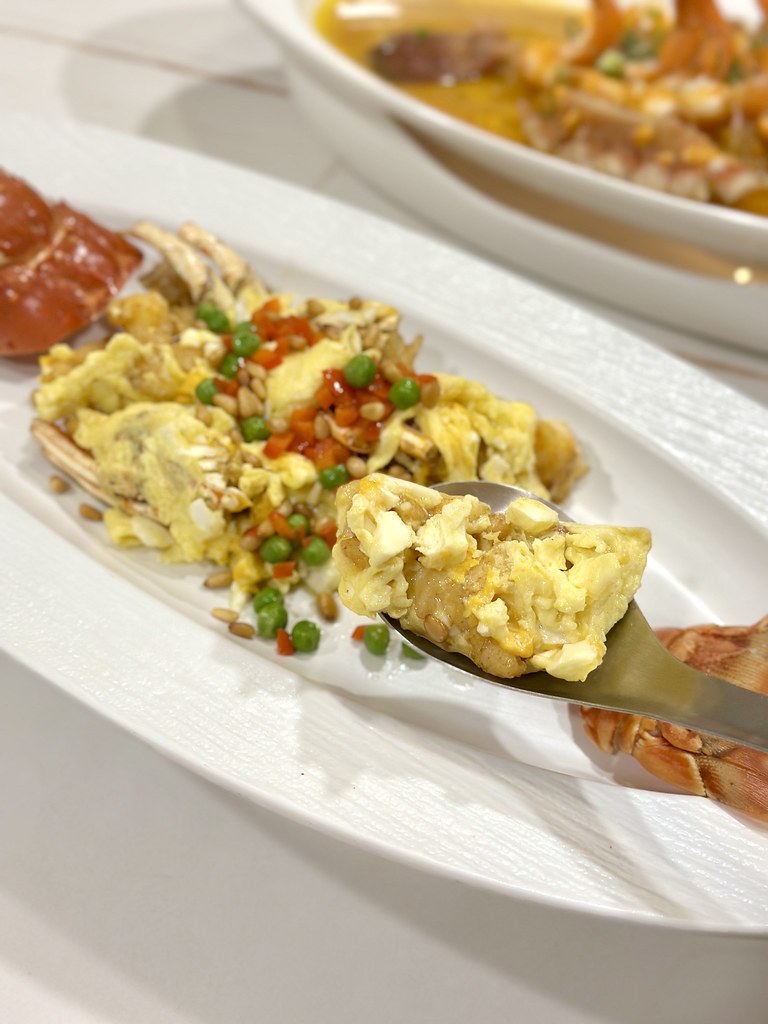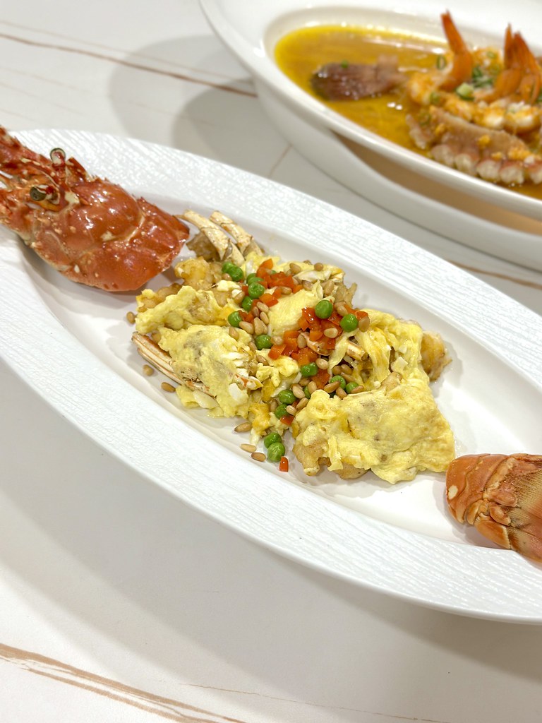 黃金雙蛋燴澳洲龍蝦 – 香氣明顯的鹹蛋黃與雞蛋融合成雙蛋 , 包覆大隻且彈牙滑嫩的澳洲水姑娘龍蝦 , 又鮮又有滋味