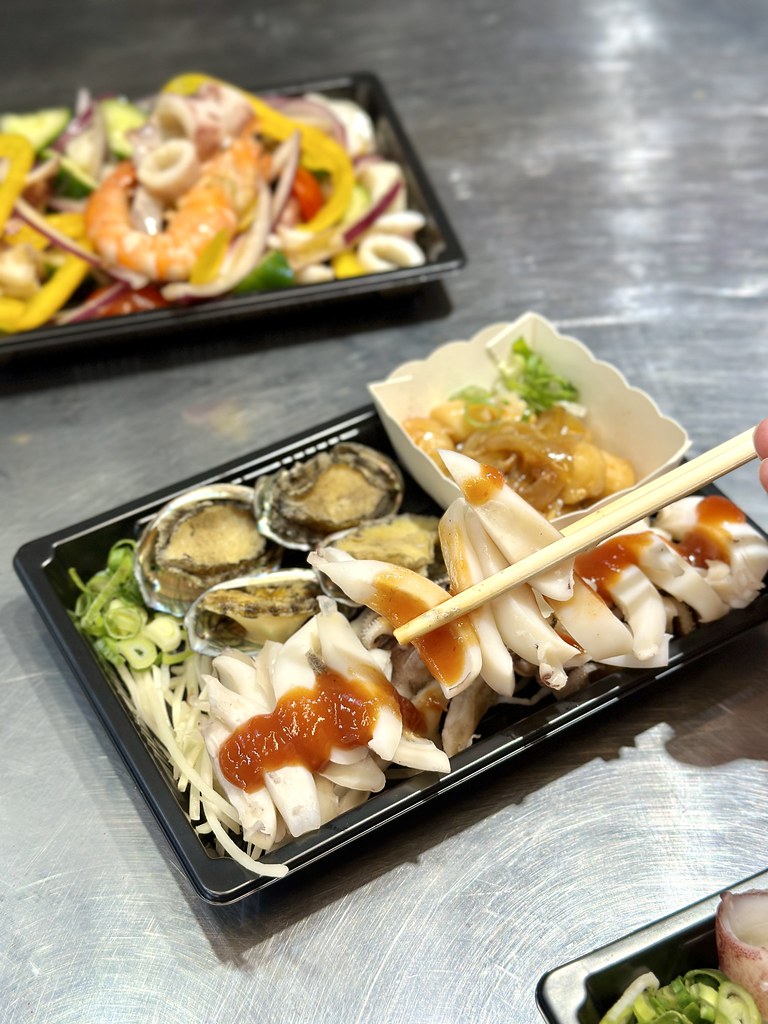 川燙花枝、鮑魚搭配五味醬超級對味 , 而且鮑魚有去除連接的內臟 , 且已經將鮑魚肉與殼分